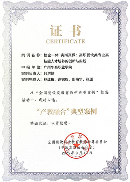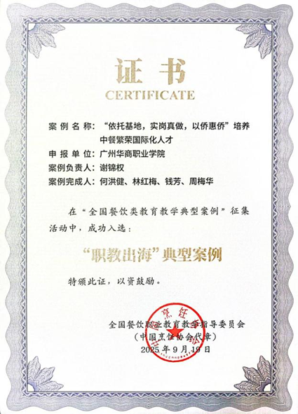 近日,从全国餐饮职业教育教学指导委员会传来喜讯,广州华商职业学院酒店管理学院申报的两项案例,在2025年“全国餐饮类教育教学典型案例”征集活动中成功入选,其中“校企一体 实岗真做:高职餐饮类专业高技能人才培养的创新与实践”入选“产教融合”典型案例;“依托基地,实岗真做,以侨惠侨”培养中餐繁荣国际化人才入选“职教出海”典型案例。