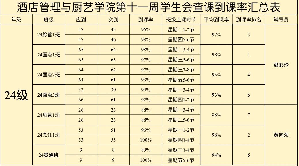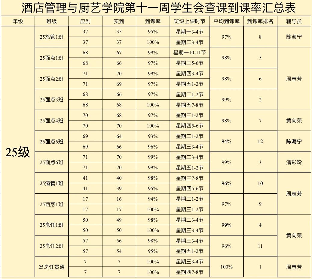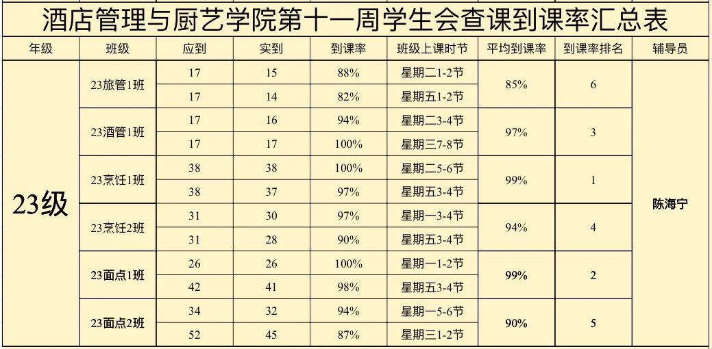 酒店管理与厨艺学院第十一周到课率
