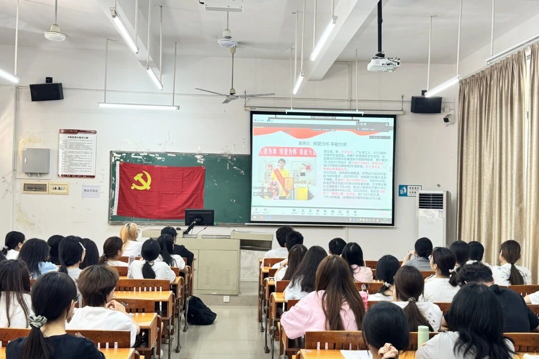 讲座伊始,陈金苗老师从中国共产党成立的历史切入,系统阐述了党“以人民为中心”的根本立场及革命、建设、改革时期的伟大成就。为让抽象理论具象化,课程特别引入三位优秀校友的实践案例:中共党员袁成钧作为2024届西部计划志愿者,服务新疆喀什基层;陈冠辞去导游职务,赴四川凉山支教并任校长;中共党员苏文贤以1195小时志愿服务、150小时救援及造血干细胞捐献诠释担当。