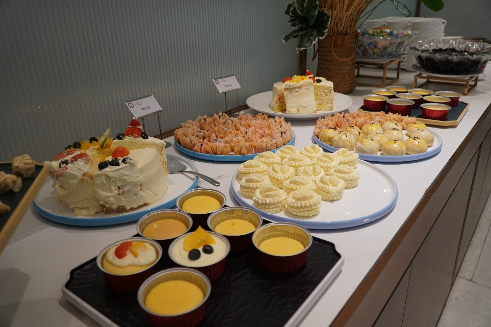 【创新融合类】水果塔——塔皮由企业师傅亲授“黄油香酥配方”,层次分明;内填低脂酸奶慕斯,铺上新鲜草莓、蓝莓等时令水果,顶部撒上糖粉,无添加蔗糖的设计契合健康理念,是弘美餐厅的热门甜品。
