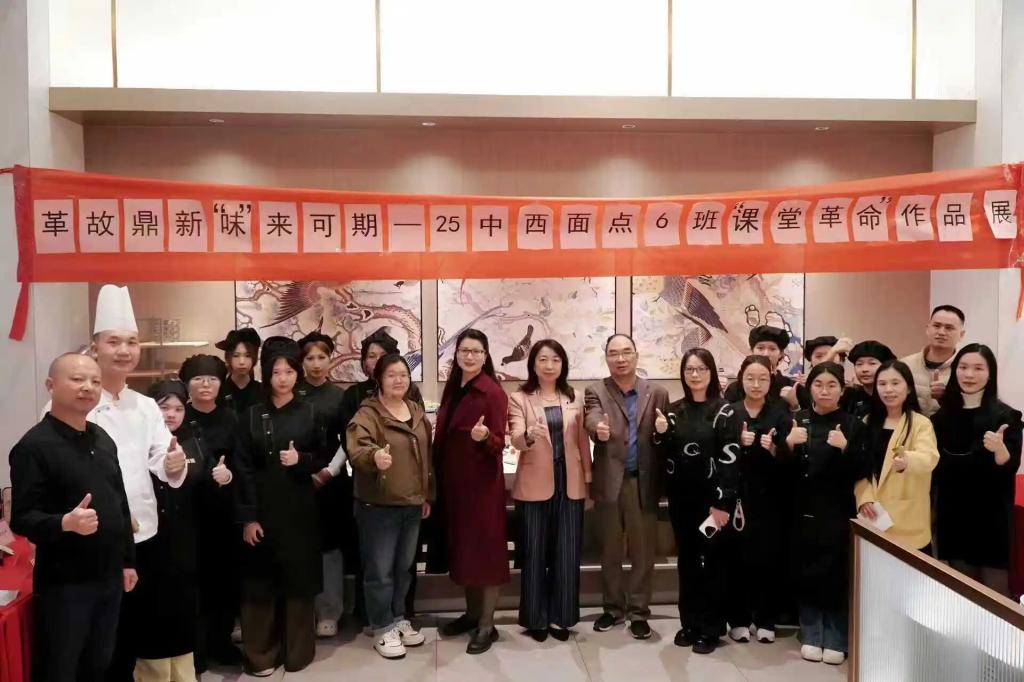 2025年12月17日下午,25中西面点6班揭榜挂帅“课堂革命”期末考核作品展在校园弘美餐厅顺利举办。本次活动以深化“课堂革命”为核心,通过分组主题创作的形式检验教学成效,邀请教育研究院杨伟传院长,教务部刘玉娟部长、陈柳红副部长、林伟烜副部长,酒店管理与厨艺学院金申启副院长,弘美餐厅吴浩波总厨及各中西面点工艺专任老师莅临指导并担任评委,活动现场亮点纷呈、成果丰硕。